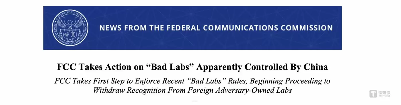 美国FCC方面表示,此次行动主要应对所谓“不良实验室”带来的威胁。