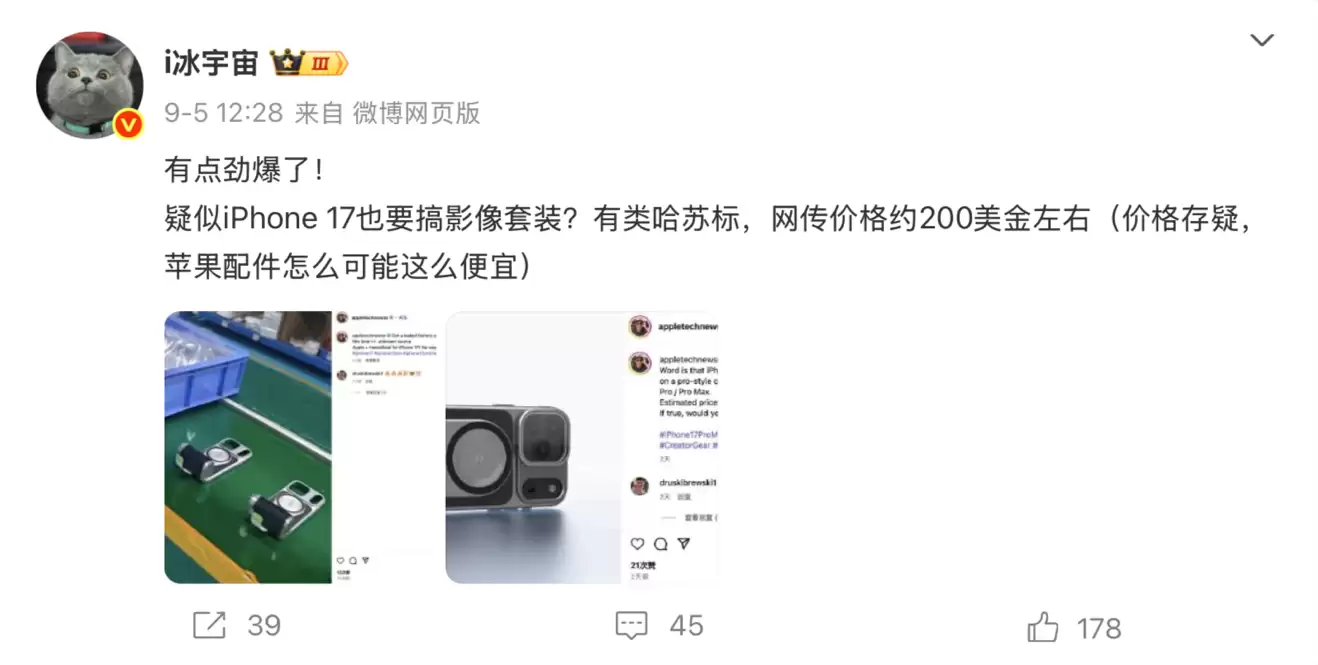 近日,一则关于 iPhone 17 影像套装的爆料在社交媒体上迅速传播。9 月 5 日,知名数码博主“i冰宇宙”在微博转载外媒爆料信息,称 iPhone 17 可能会推出带有哈苏标识的影像配件套装,网传价格约为 200 美元。相关配图显示,该产品形态与小米和 vivo 的影像套装类似,包括支持 MagSafe 的磁吸手柄,手柄背面还出现醒目的 “H” 标志,引发大量网友猜测其是否为苹果与哈苏合作推出的新品。