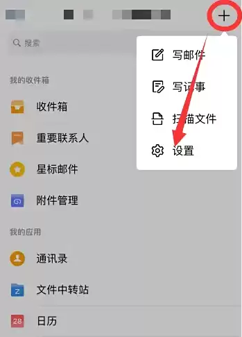 手机qq邮箱中,点击右上角加号之后,点击“设置”。