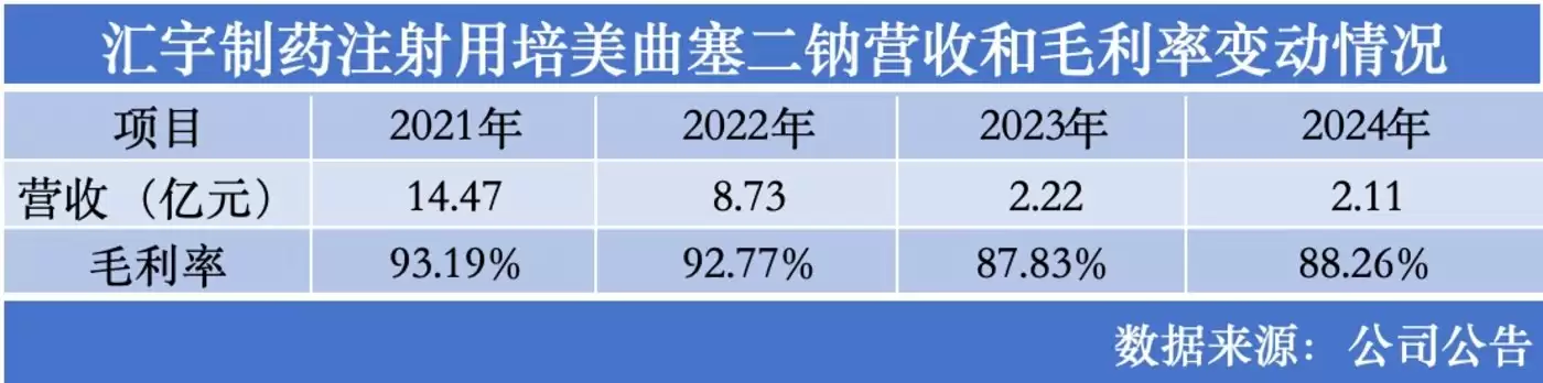 观察君梳理发现,2024年达到顶峰后,汇宇制药注射用培美曲塞二钠的营收快速锐减,已经从2024年的14.47亿元降至2024年的2.11亿元;毛利率也从93.19%降至去年的88.26%。