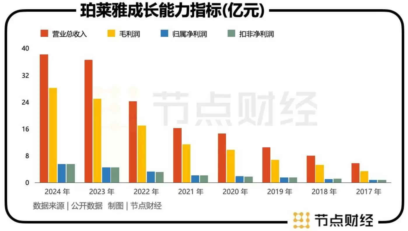 《节点财经》发现,长期以来,珀莱雅以“营销驱动”著称,研发投入占比始终偏低。2024—2024年,研发费用率均在2%左右,2024年研发费用2.1亿元,占营收比例仅1.95%。