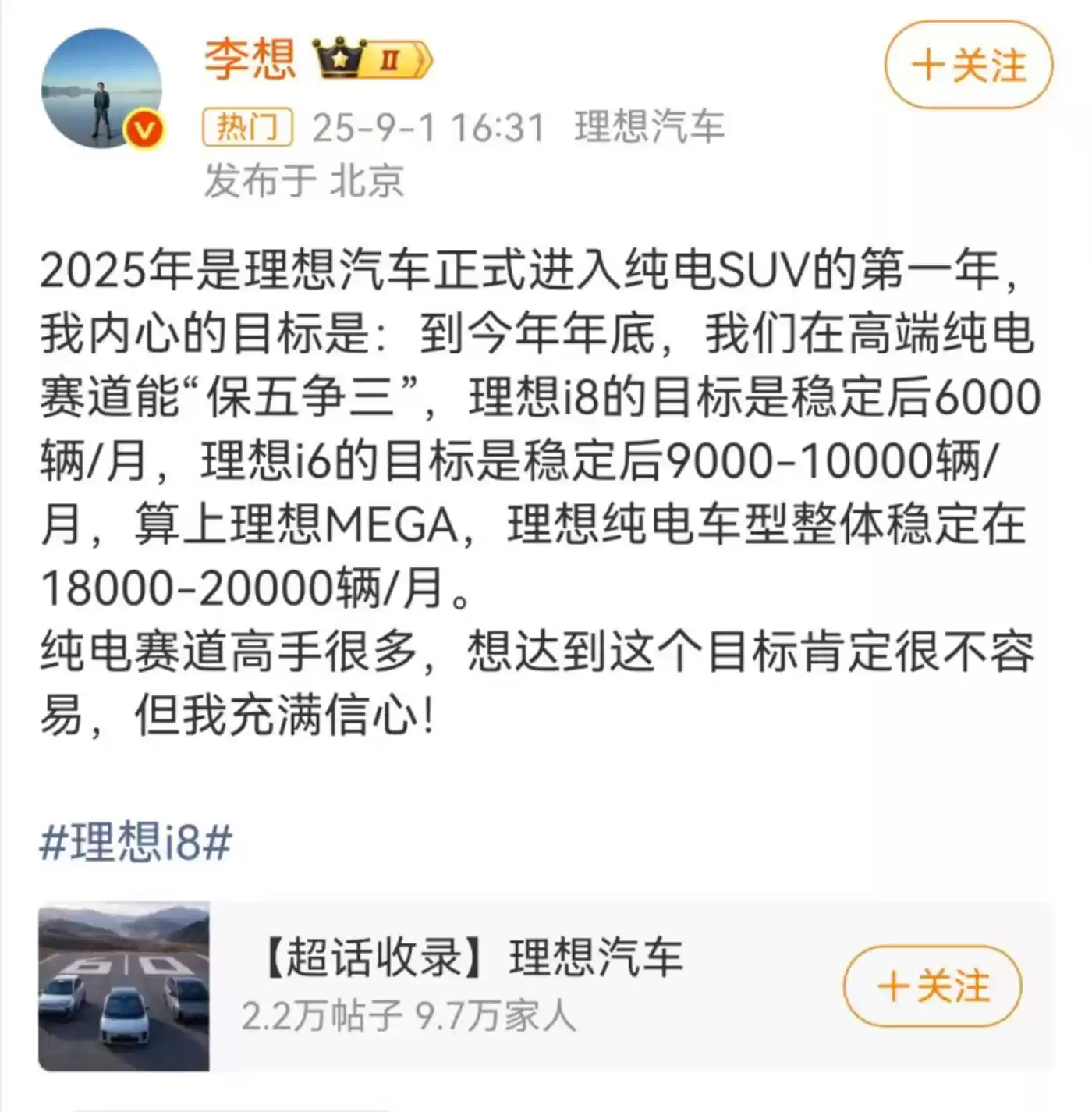 但在MEGA遭遇挫折后,我们能感觉到李想在公众视野中变得相对沉默。这在我看来,是一种资源的浪费。在公司面临销量压力、市场出现疑虑的关键时刻,最需要的就是创始人的声音。