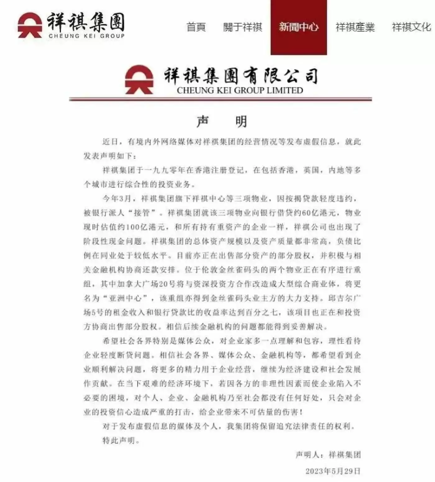 祥祺集团很快通过“同心俱乐部”公众号回应,承认“因系列事件出现短暂现金流断裂”,但表示“相信短时间内可妥善解决”。公司称,这三项核心物业最新估值约98亿港元,虽较疫情前下跌,但仍高于50亿港元贷款规模,负债率不足60%。