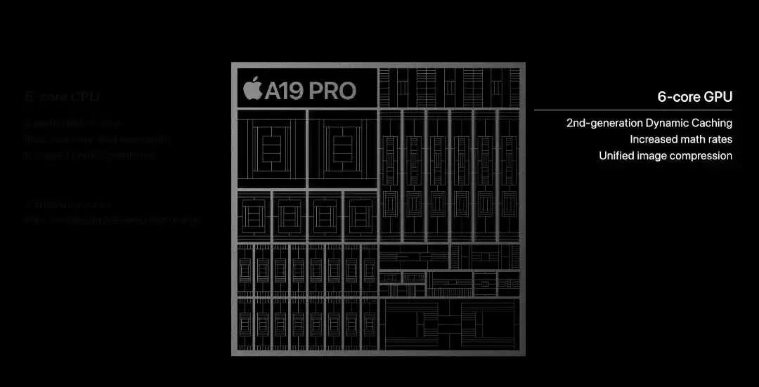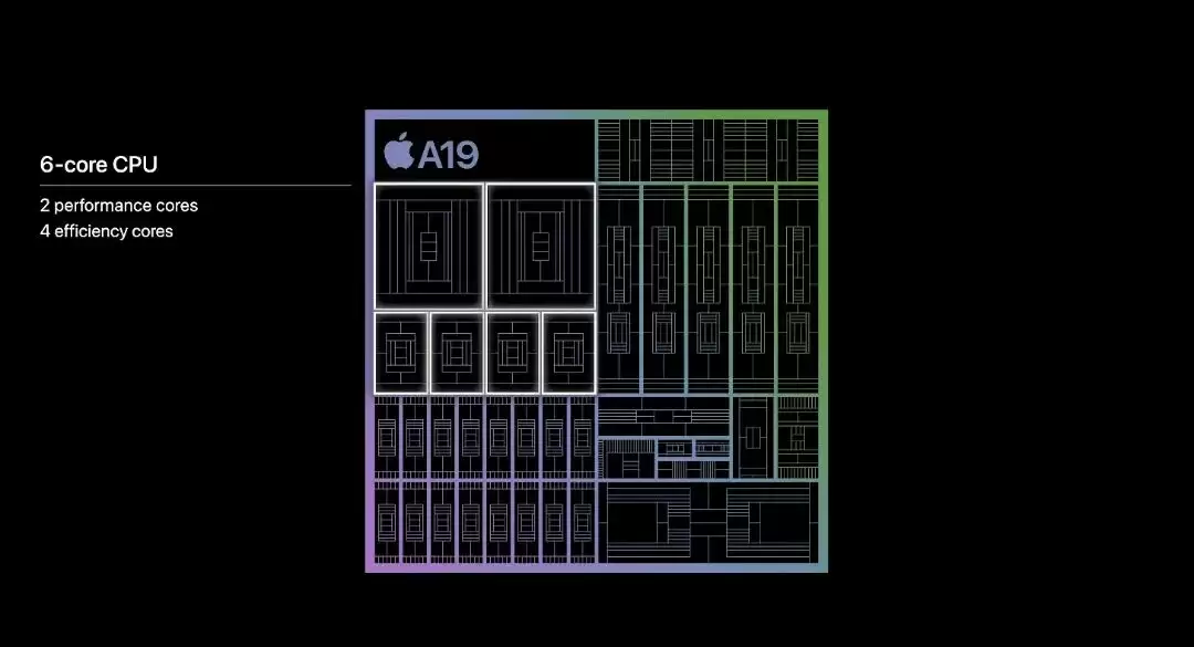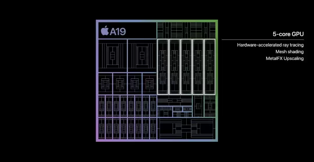 具体而言,A19 拥有六个 CPU 核心和五个 GPU 核心。该处理器拥有四个效率核心和两个性能核心,而 GPU 则在硬件加速光线追踪、网格着色和 MetalFX 升级方面不断进步。