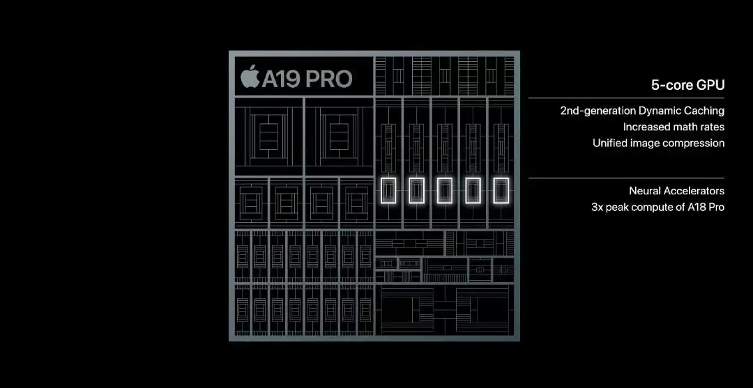 强劲的 A19 Pro 配备全新 6 核 CPU,提升了用户日常任务的性能和效率,是所有智能手机中最快的 CPU。5 核 GPU 架构升级,带来包括 3A 大作在内的全新移动游戏体验。每个 GPU 核心均内置神经加 速 器,使 GPU 峰值计算能力比上一代提升高达 3 倍,非常适合驱动设备端运行的生成式 AI 模型。