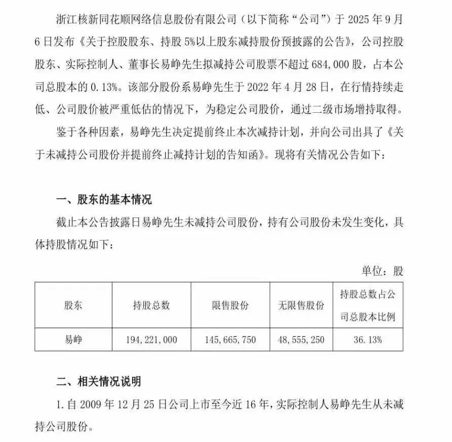 9月9日凌晨,同花顺(300033.SZ)发布公告称,公司实控人、董事长易峥“鉴于各种因素”,决定终止此前提出的减持计划。目前,易峥尚未减持公司股份。