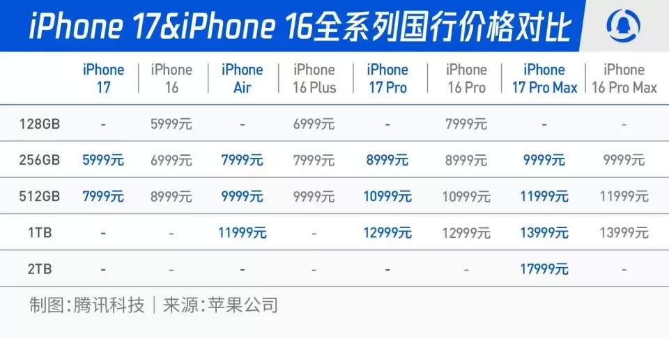 先说价格,全系iPhone的国行版起售价格分别为5999元、7999元、8999元和9999元,其中iPhone 17的价格比较有诚意,依旧是5999元起,但是配置从上一代的128GB,扩容到了256GB。