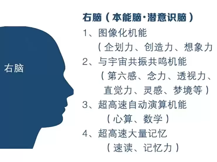 一些机构科普道,我们平时学习思考的时候只用到了左脑的基本功能,比如理解、推理、判断。而鲜少用到右脑的功能——也就是图像机能、与宇宙共振共鸣机能、自动演算机能和超高速大量记忆功能。