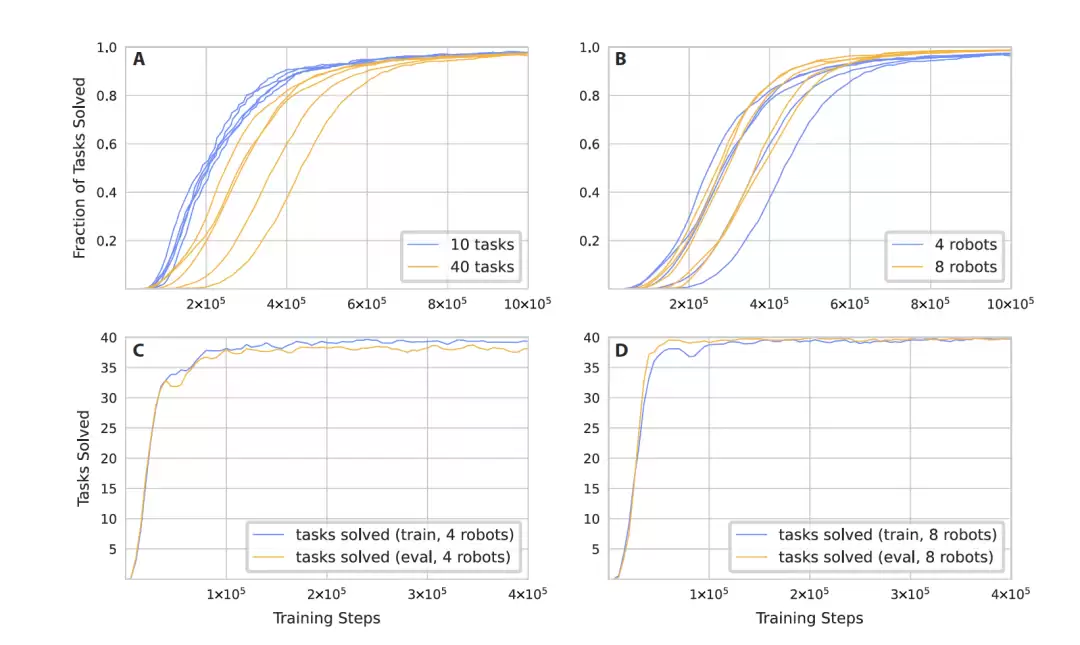 在训练时间的扩展性方面,即使任务数量增加四倍,RoboBallet收敛所需的训练步数也只是略有增加。