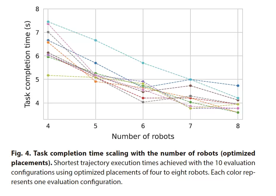 在多智能体协同方面,随着机器人数量从4个增加到8个 ,平均执行时间减少了约60%。