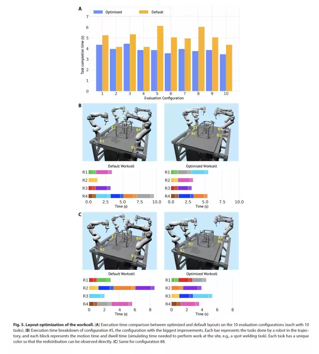 最后,RoboBallet 的高速和可扩展性使其能够应用于工作单元布局优化(将任务执行时间缩短了33%)、容错规划和基于在线感知的重新规划等新能力。