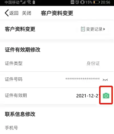 第三步,进入变更界面后,点击证件有效期边上照相机图样按钮。