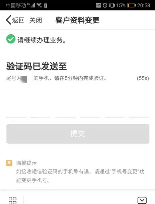 第七步,人脸识别成功后,系统会要求手机验证,规定时间内输入验证码即可。