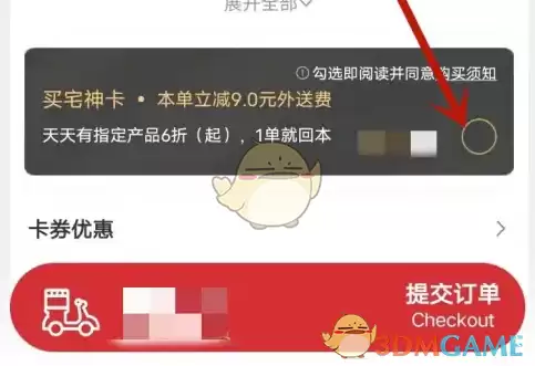 4、显示宅神卡,当月每单外卖消费满19元免外送费规则。