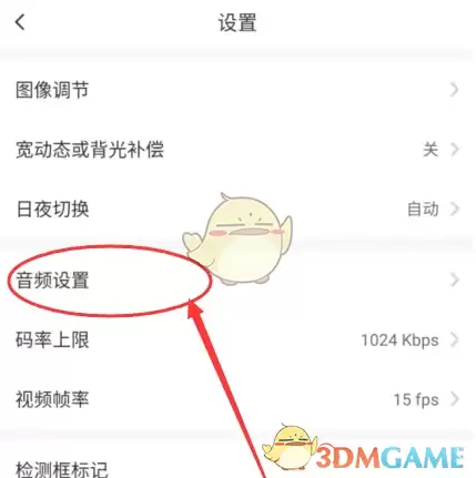 4、在设置界面,找到并点击“音频设置”;若没有“音频设置”区域,则表明该摄像机不支持调节输入、输出音量,只能使用默认的输入输出音量大小。