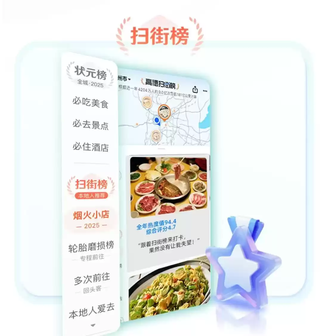 简单来说,高德扫街榜基于用户真实导航行为生成榜单(如“景点榜”“酒店榜”“美食榜”),打开扫街榜,用户会看到对应不同类型行为的排行榜,有体现远距离专程前往的“轮胎磨损榜”,有体现多次前往的“回头客榜”,还有本地人爱去、城市特色体验、高分烟火小店等多类排名,每个分类都会根据动态数据每日更新。