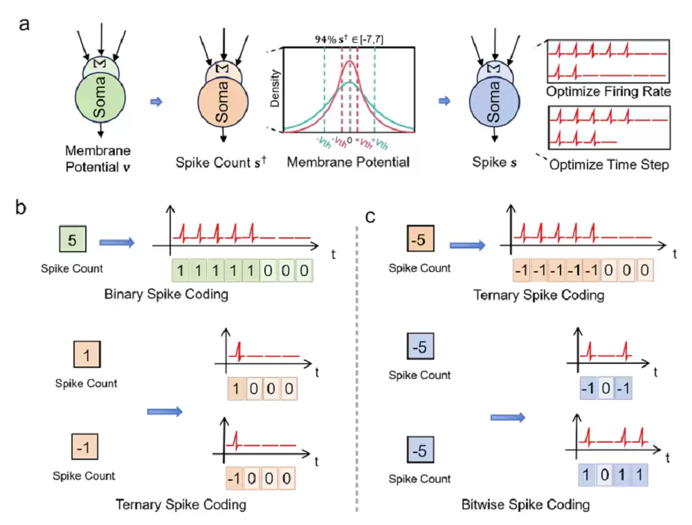 SpikingBrain提供三种编码方式:二值脉冲简单低能耗;三值脉冲支持类似生物神经系统的兴奋-抑制调控,减少时间步和脉冲总数;二进制脉冲可在高计数场景下显著降低计算量和能耗。