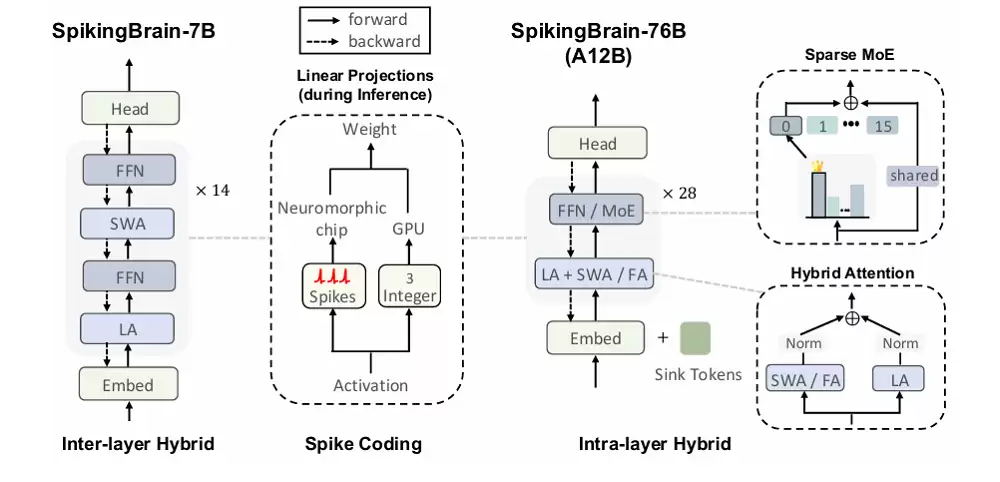 基于上述理论研究,SpikingBrain团队在模型架构中集成了混合高效注意力、MoE模块和脉冲编码三大核心组件。