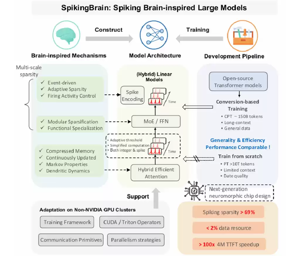 中科院自动化研究所称,这是我国首次提出大规模类脑线性基础模型架构,也是我国首次在国产GPU算力集群上构建类脑脉冲大模型的训练和推理框架。