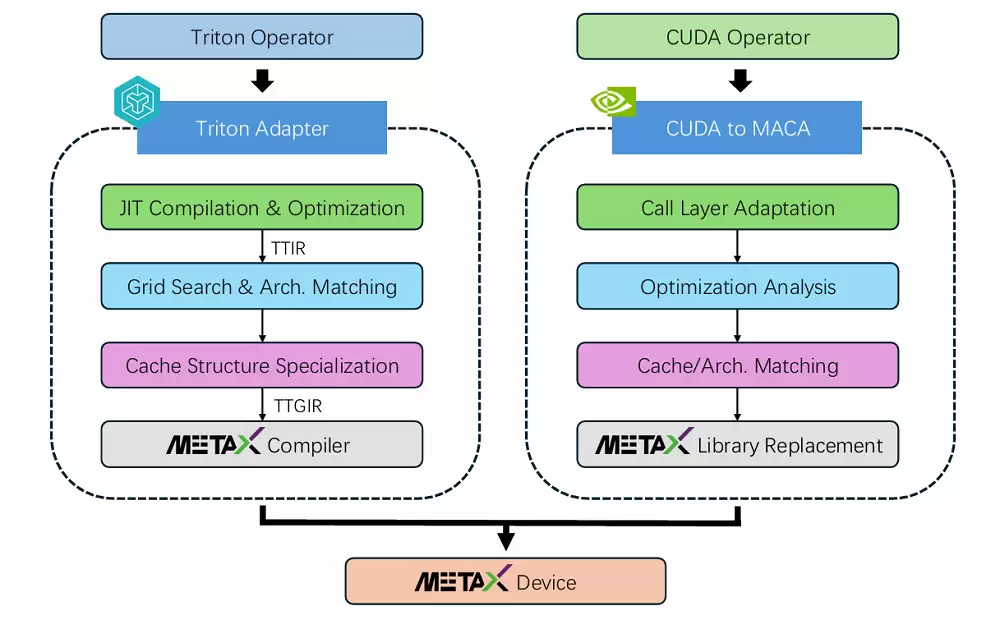 这一适配过程包括Triton适配、CUDA向MACA(沐曦兼容CUDA的软件栈)框架迁移两部分。这两条路径针对模型内部不同算子进行优化,结合形成适用于沐曦GPU的硬件适配方案。
