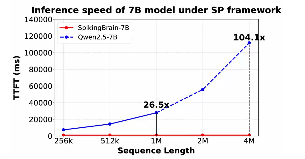 在长序列推理场景中,SpikingBrain-7B模型在100万个token长度下TTFT(生成第一个Token所需时间)相比Transformer架构加速达到26.5倍,400万Token长度下加速超过100倍。