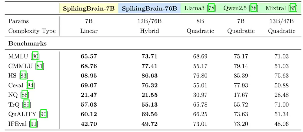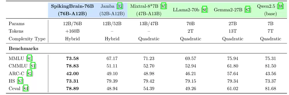 SpikingBrain-76B混合线性MoE模型几乎完全恢复了基座模型性能。