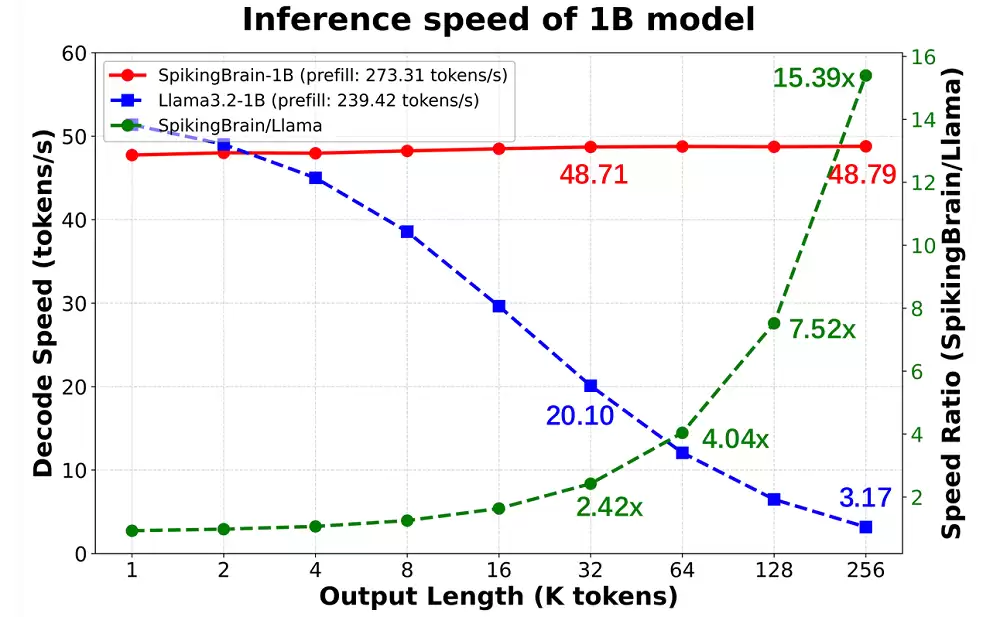 同时在手机CPU端64K、128K、256K长度下,SpikingBrain较Llama3.2的同规模模型推理速度分别提升4.04倍、7.52倍、15.39倍。
