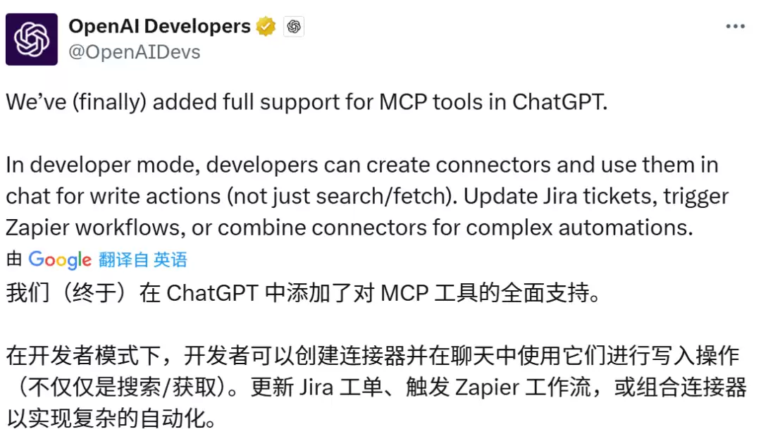 今天,OpenAI正式官宣ChatGPT的MCP功能上线。