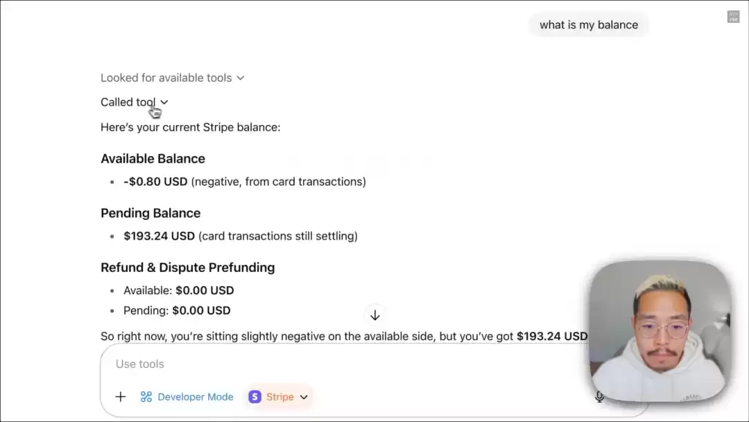 你当然可以直接掏出手机打开Stripe看余额,但Demo这里是为了展示,ChatGPT已经可以获取到了Stripe个人账户中的数据,可以用它参与到其他复杂环节了。