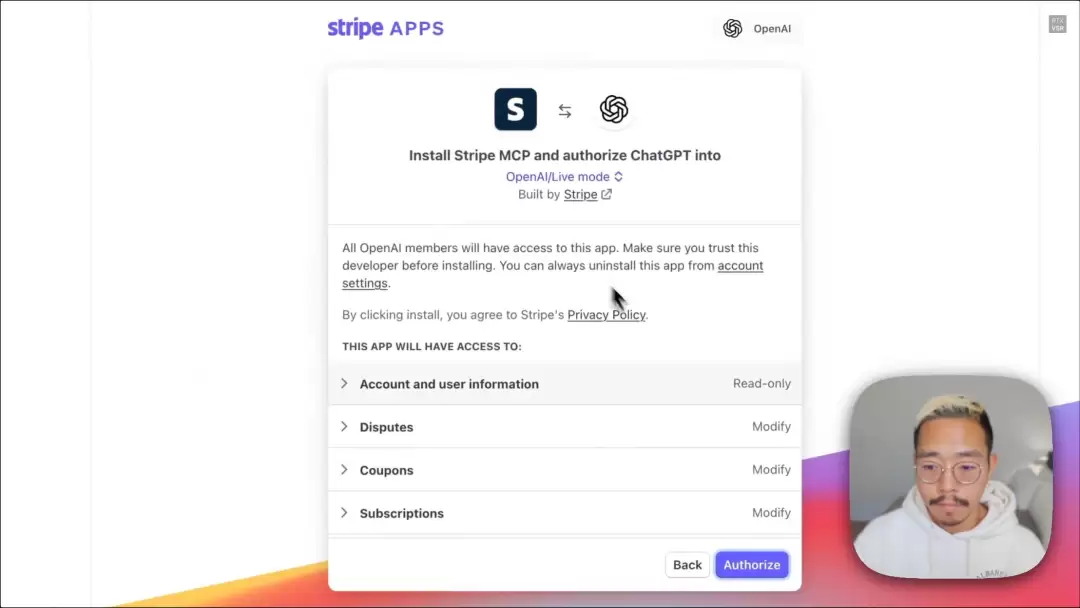 在示例中,需要Stripe(类似支付宝的国外流行App)这边为OpenAI授权相关权限。