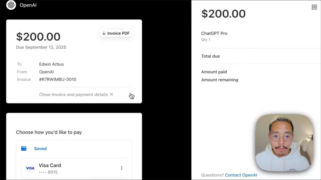 下一步,Demo中的这位OpenAI员工Edwin Arbus,给出了Prompt:收取ChatGPT Pro费用并开发票。