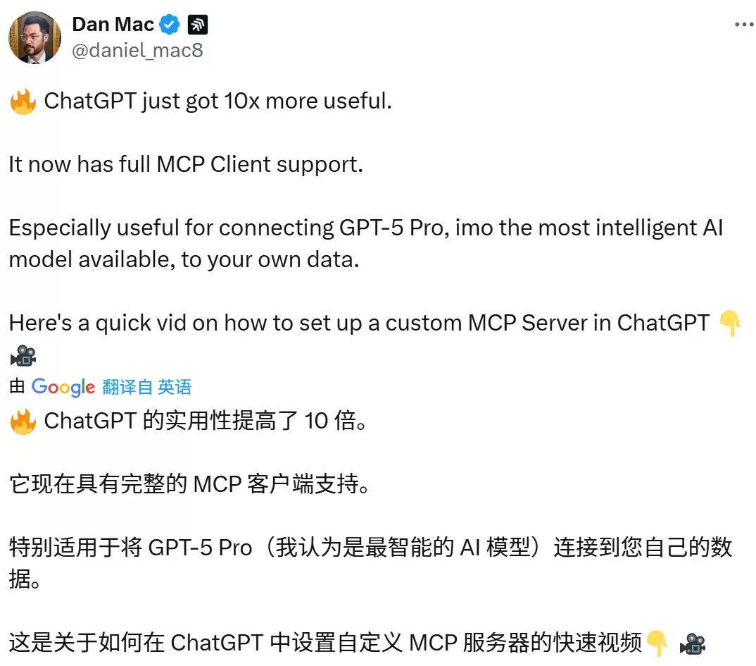 有网友表示,仅仅加上MCP支持,就让ChatGPT更有用了10倍。