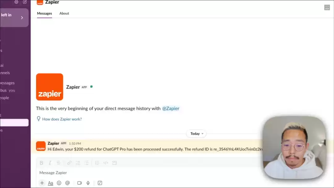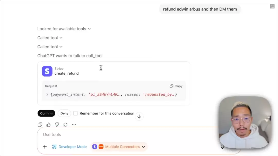 接下来,Demo为我们演示了退款:为刚刚订阅的ChatGPT Pro进行退款操作,并给出通知。