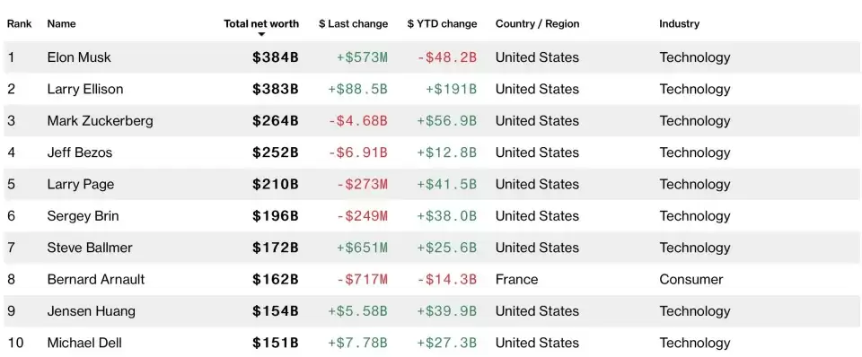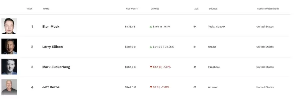 不过,实时更新的《福布斯》富豪榜提供的数据显示,马斯克目前依旧是全球首富,净资产达到4361亿美元。埃里森的净资产在9月10日激增945亿美元,达到3876亿美元,距马斯克仍有一定的差距。