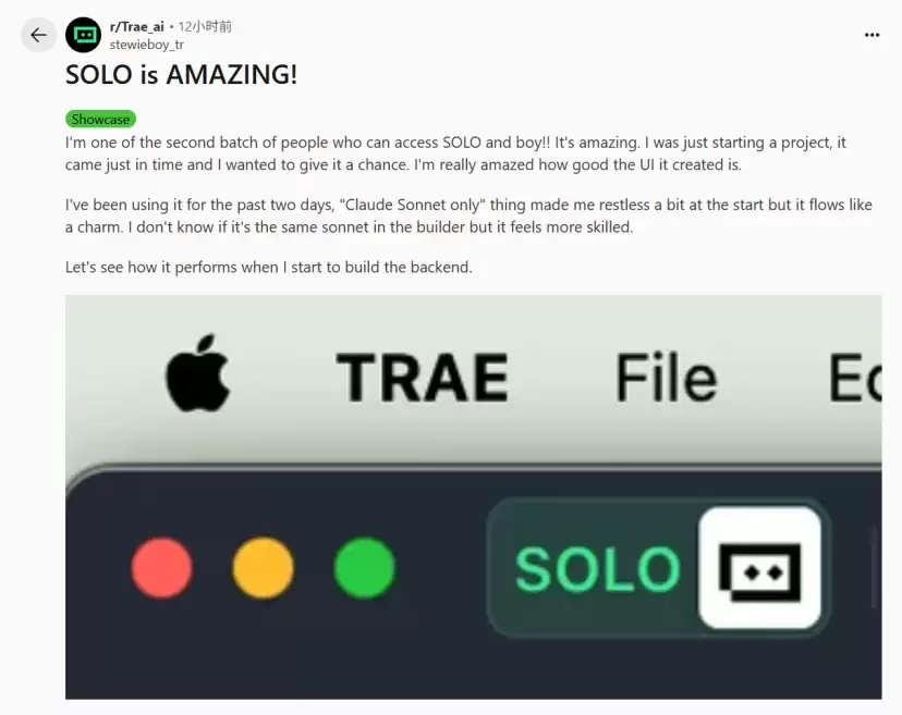 用户只需描述需求,Solo模式就能自动分解任务、制定计划、编写代码、运行测试,以及错误修复。一位Trae Pro用户在Reddit上分享道:“Solo模式用Claude时就像有个资深工程师在帮你。”
