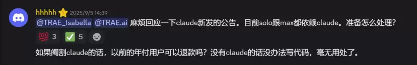 Trae的管理员在最新Discord中称,Claude仍然可用,并且表示Trae目前没有阉割Claude的消息,敦促用户“暂时不要考虑退款”。但这种不确定性已经让用户感到不安。