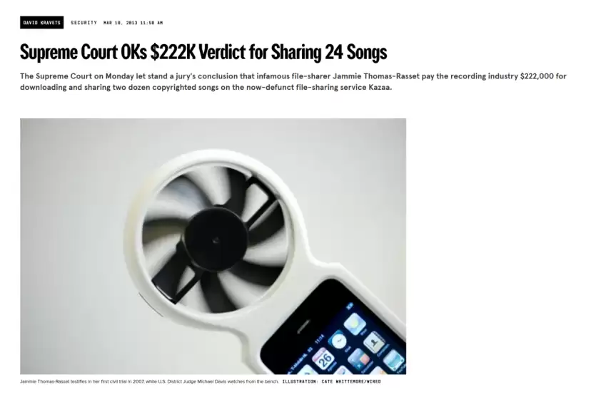 对AI公司来说,这种威胁更加严重。录音和电影行业已经证明了版权法定赔偿的威力。美国一位单身母亲因为分享24首歌曲被判赔偿22.2万美元,连审理此案的法官都谴责这一结果“与所遭受的损害完全不成比例”。录音和电影行业最终起诉了数十万个人进行文件共享违法行为,每人获得数千美元的和解金——基本上是被告能承受的全部金额。
