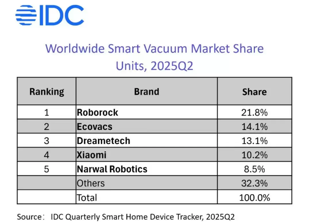 数据显示,2025年Q2,全球智能扫地机器人市场出货量达617万台,同比增长20.5%。从竞争格局来看,行业集中度持续向头部品牌倾斜,中国品牌包揽了全球扫地机器人销量前五,合计占据67.7%的市场份额。值得关注的是,iRobot的市场份额正持续下滑。在2025年Q1,其全球出货量同比下降30.6%,当时市场份额排名已跌落第五。到Q2,iRobot的市场排名已被云鲸智能(海外品牌名NARWAL)反超。