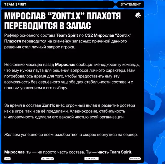 截至目前,zont1x的离队事件堪称本赛季最令人困惑、最不合逻辑的事件之一。唯一明确的是:zont1x遇到了一些问题,使他无法继续全身心投入职业生涯。因此,我们只能祝愿zont1x一切顺利,有足够的力量应对眼前的所有事情。