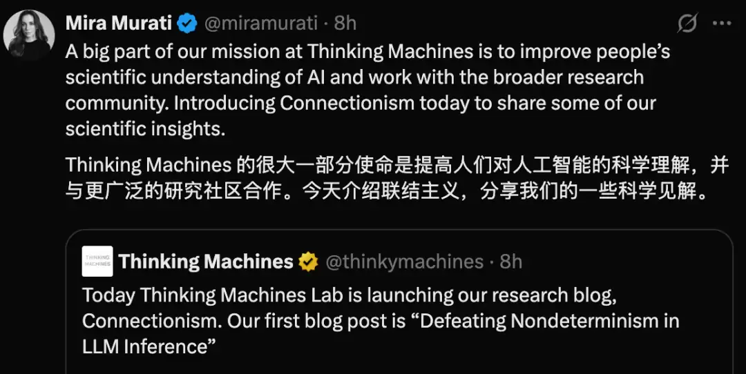 创始人、OpenAI前CTO Mira Murati亲自宣发,翁荔等一众公司大佬纷纷转推: