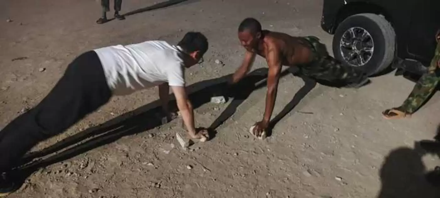 因为缺乏娱乐,齐承闻晚上和同事一起与营地大兵比赛做俯卧撑