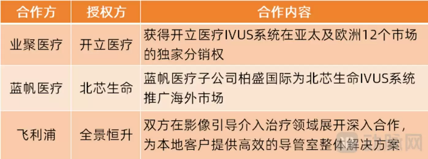 或许是由于上述国产IVUS系统的强大创新性,且行业整体获批数量少、竞争小、市场前景广阔,多家头部企业选择与国内相关企业达成战略合作:如业聚医疗与开立医疗强强联合,蓝帆医疗与北芯生命签约,飞利浦与全景恒升合作。