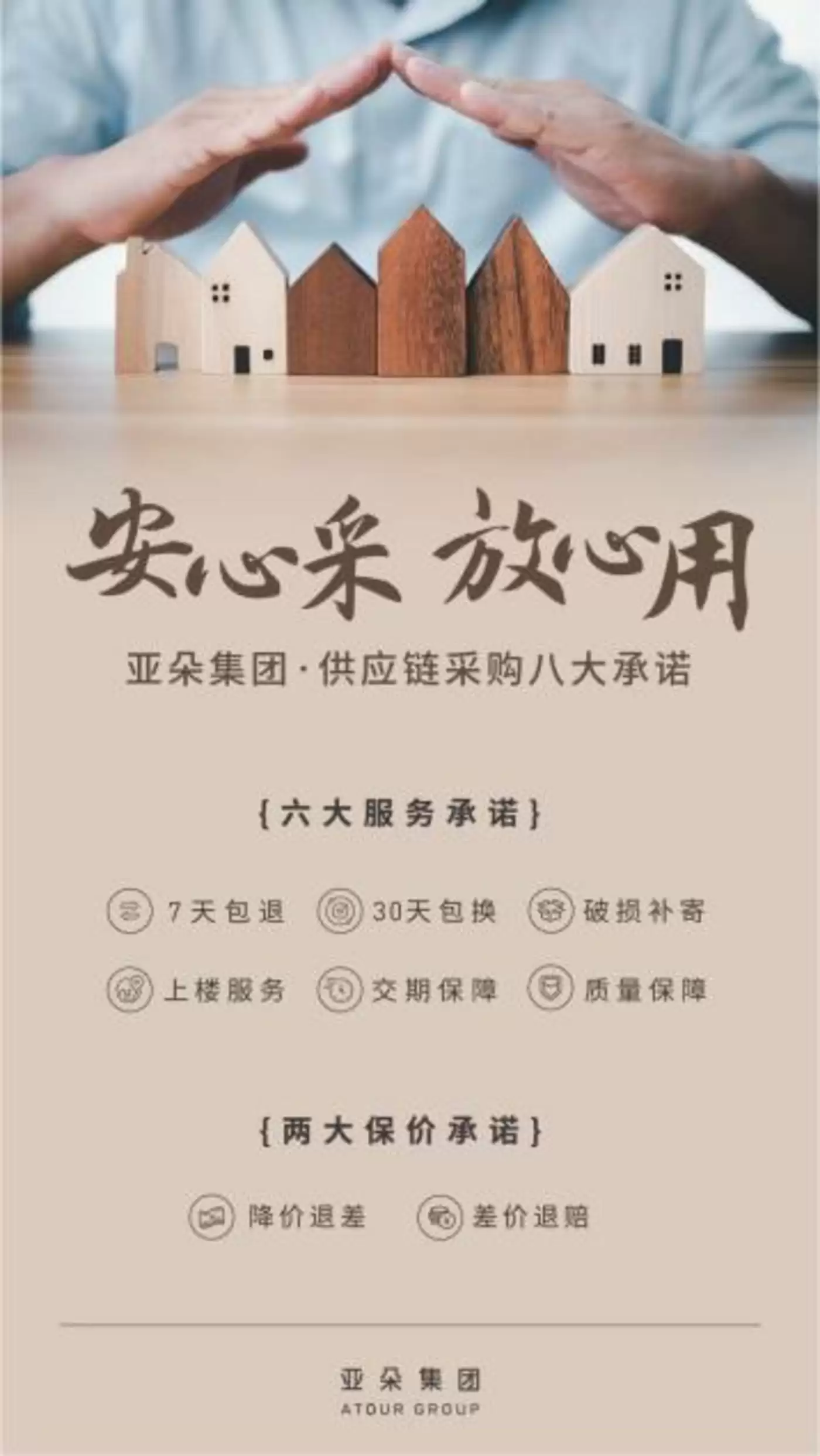 除此之外,亚朵集团还发布“供应链采购八大承诺”,涵盖了价格保障(降价退差、差价退赔)、无忧售后(7天包退、30天包换、破损补寄)、服务保障(上楼服务、交期保障、质量保障)。
