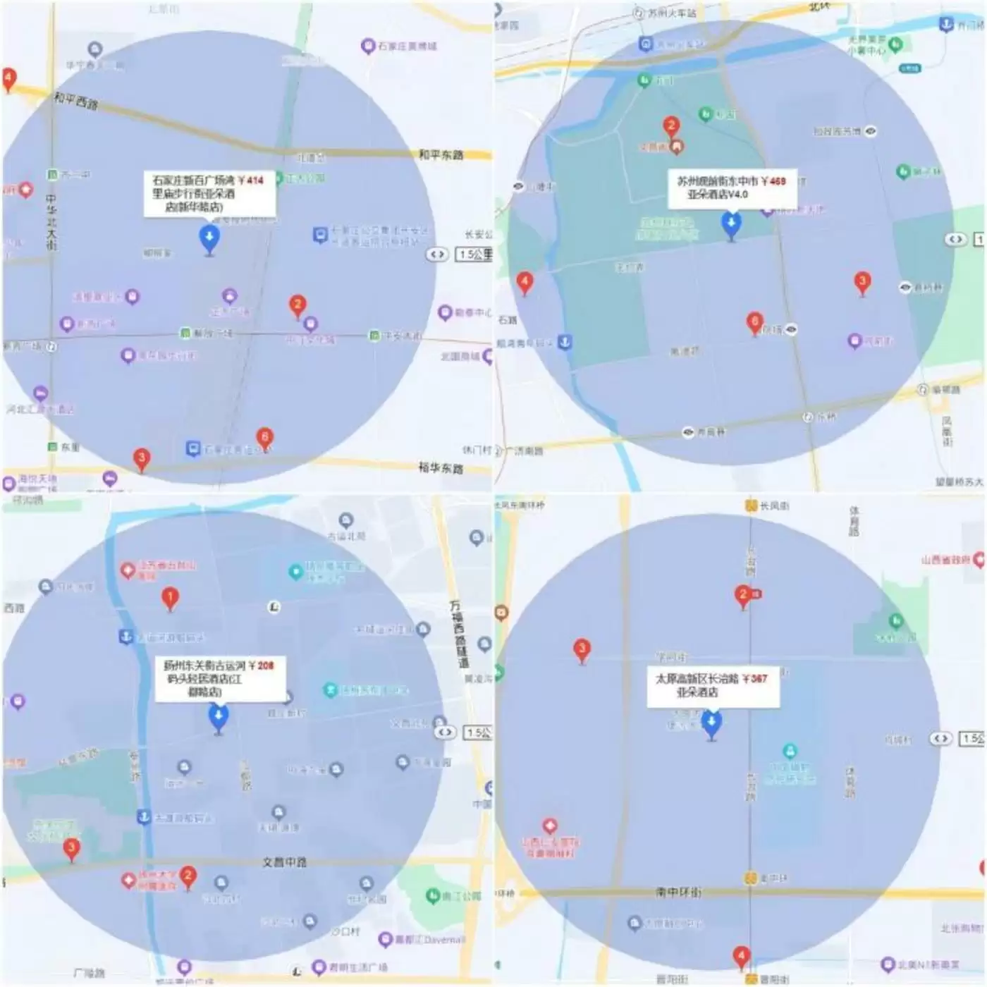 我们在百度地图上随机挑选了几个二线城市的门店为坐标点,以1.5公里为半径进行搜索,确实会出现几个亚朵扎堆的情况。