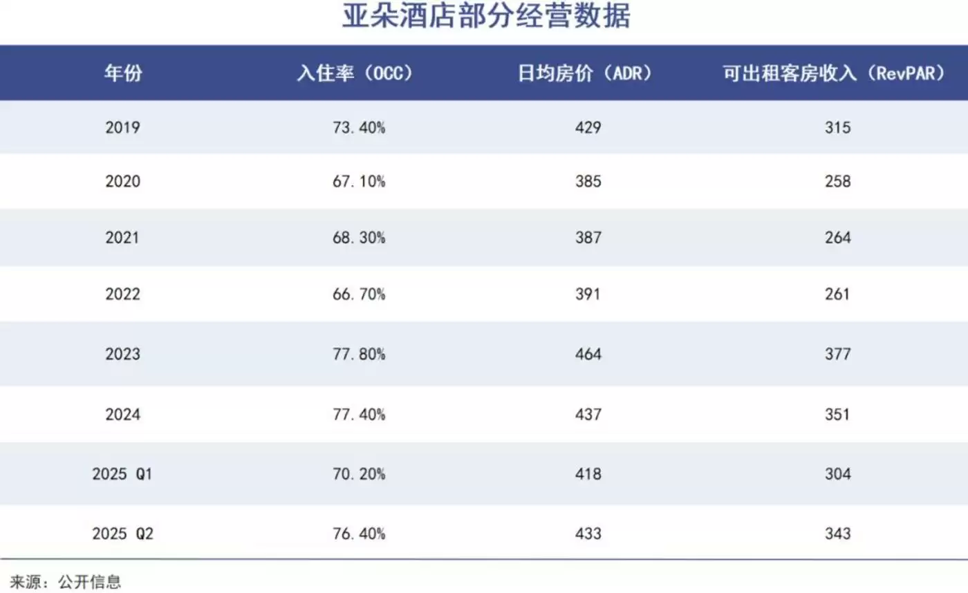 根据财报,2024年和2025年其经营的各项数据普遍下滑。今年二季度,亚朵在营酒店OCC(入住率)为76.4%,相比去年同期下滑2个百分点;ADR(日均房价)为432.8元,比去年同期降了约8元;RevPAR(平均可出租客房收入)为343.1元,相比2024年上半年减少了4.3%。