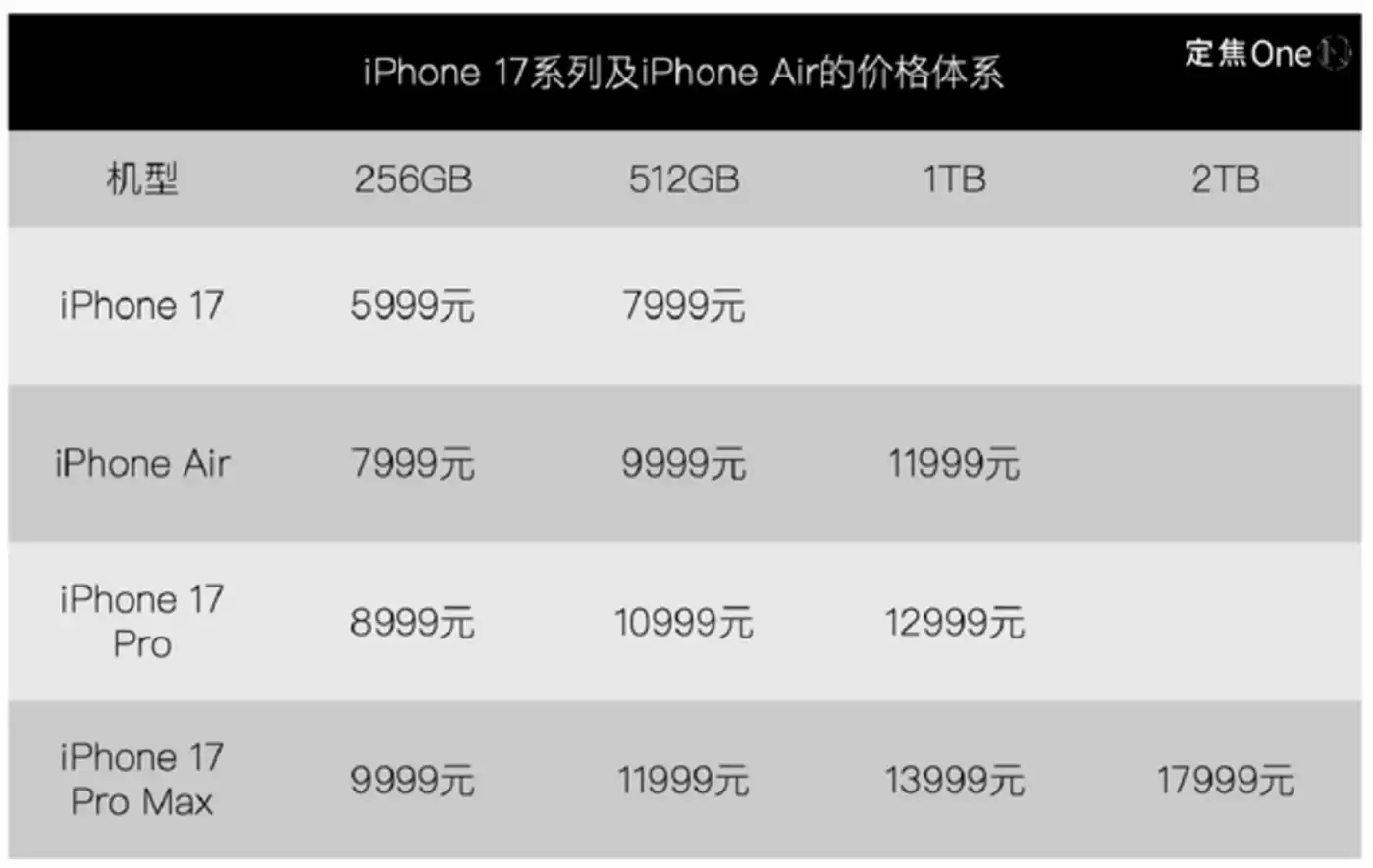 最后看定价,iPhone 17系列整体策略更精细:全系都从256GB起步,这算是一个实用的升级;Air系列7999元的起售价正好填补了标准版和Pro版之间的空白;Pro Max还新增了2TB版本,售价高达17999元,明显是针对专业用户的。