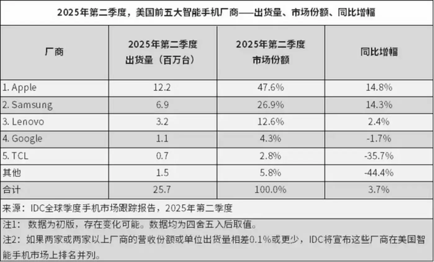 数据验证了这一点。IDC显示,2025年二季度,苹果在美国市场出货量增长14.8%,在前五名厂商中增速最快,份额稳居第一(47.6%)。