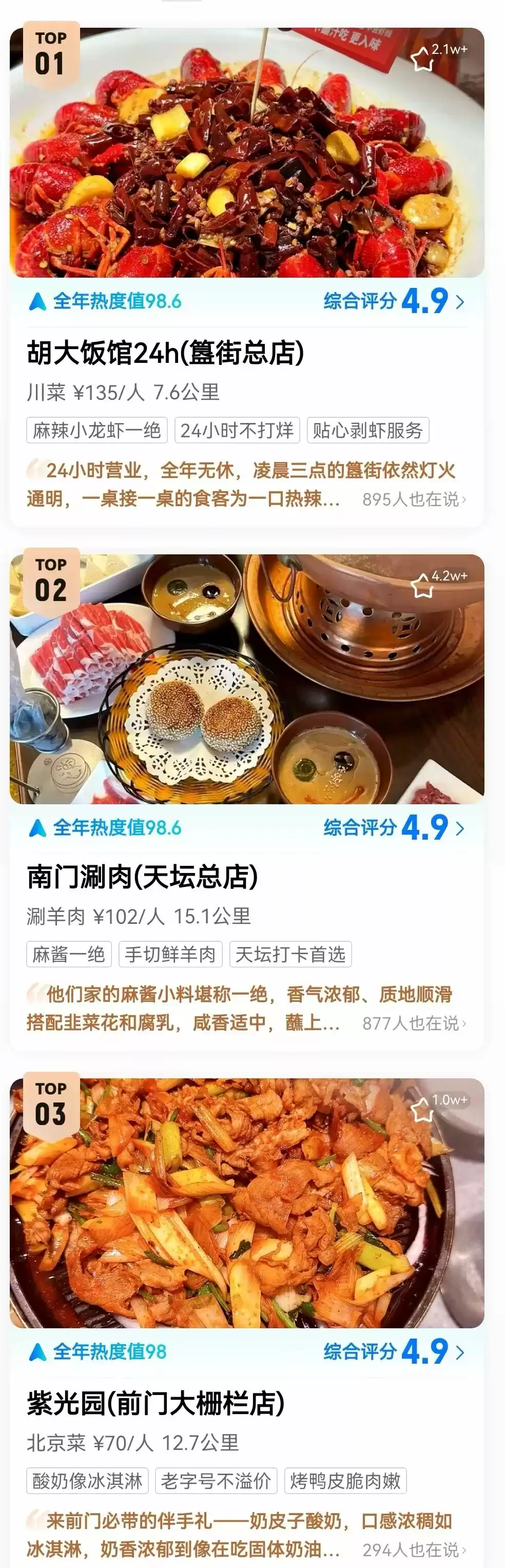 其中,第一名川菜馆综合评分4.9分,人均价格135元,全年热度值98.6;第二名涮羊肉综合评分4.9分,人均价格102元,全年热度98.6;第三名北京菜综合评分4.9分,人均价格70元,全年热度98。