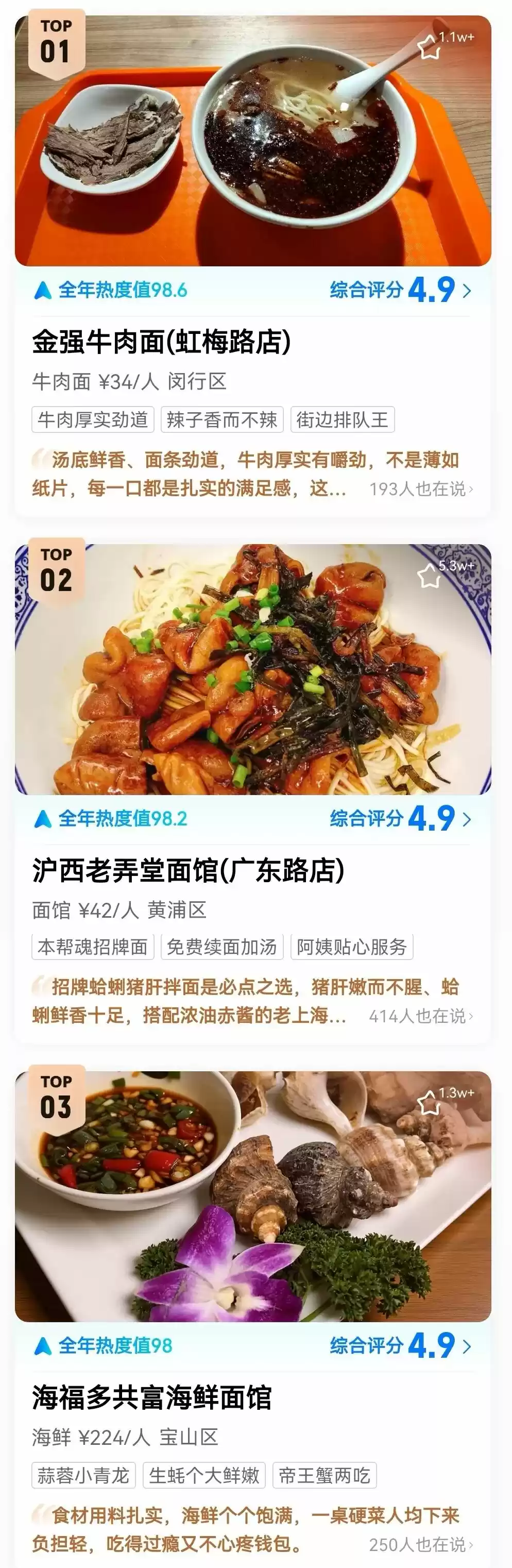其中,第一名的牛肉面馆综合评分4.9分,人均价格34元,全年热度值98.6;第二名的本帮面馆综合评分4.9,人均价格42元,全年热度值98.2;第三名的海鲜面馆综合评分4.9分,人均价格224元,全年热度值98。