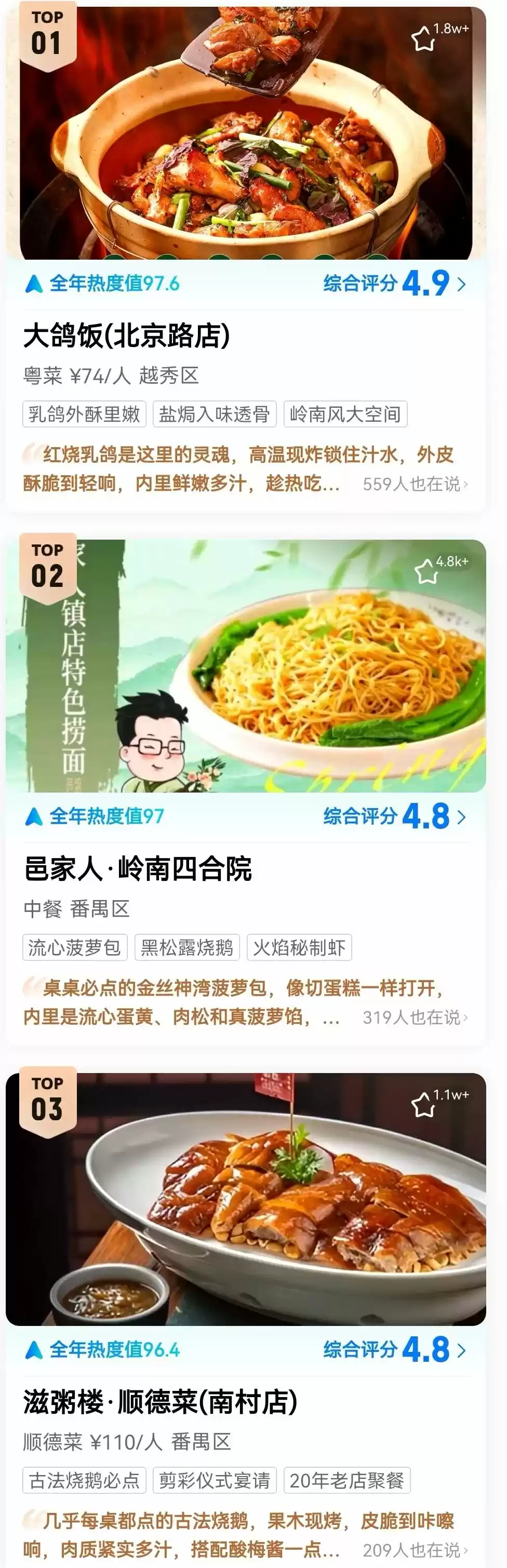 其中,第一名做乳鸽的餐厅综合评分4.9分,人均74元,全年热度值97.6;第二名综合评分4.8分,人均未显示,全年热度值97;第三名顺德菜综合评分4.8分,人均110元,全年热度值96.4。